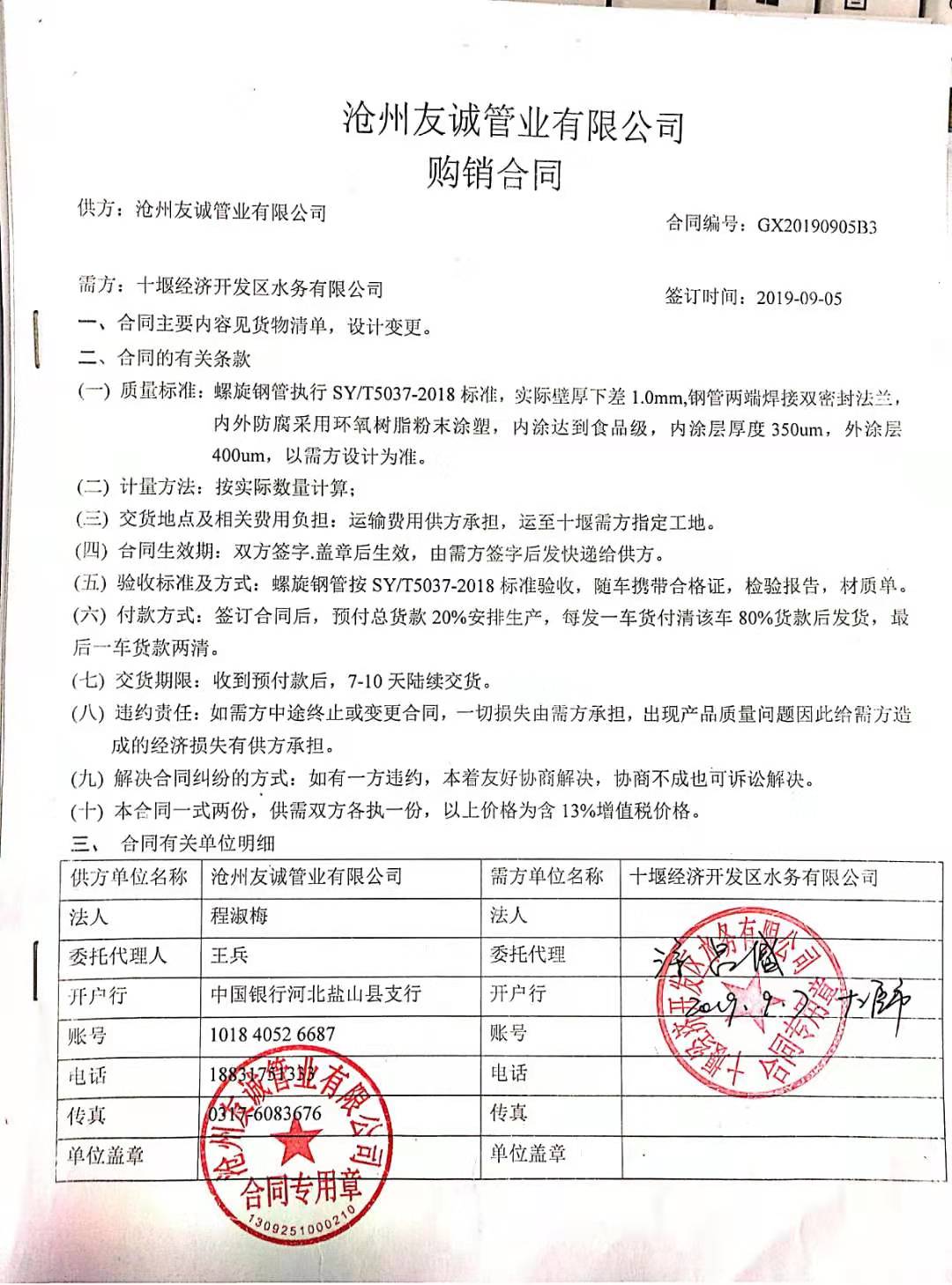 2019年9月友誠管業(yè)與十堰經(jīng)濟開發(fā)區(qū)水務(wù)有限公司簽訂十堰經(jīng)濟開發(fā)區(qū)空港產(chǎn)業(yè)園供水管網(wǎng)工程(小康大道)雙密封法蘭涂塑復(fù)合鋼管購銷合同,源于客戶對我們友誠管業(yè)的信任,我們也感恩所有客戶的支持與信任!